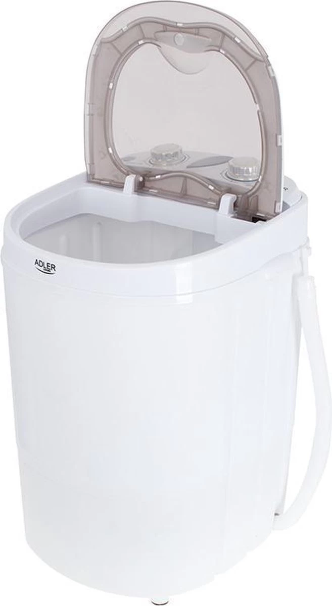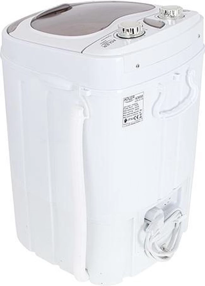 Toeristische wasmachine, perfect voor langere uitstapjes met het gezin. Hij past gemakkelijk in de kofferbak of caravan. Het werkt ook goed in tuinhuizen dankzij stil en efficiënt werk. Hij weegt slechts 6 kg en kan tot 3 kg kleding dragen.
