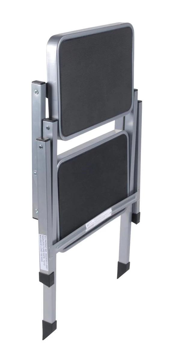 Extra stevig opstapje met dubbele trede. Voorzien van een stalen frame met antislip bekleding. Na gebruik zeer compact en plat opvouwbaar. Maximale belasting: 150 kilogram.