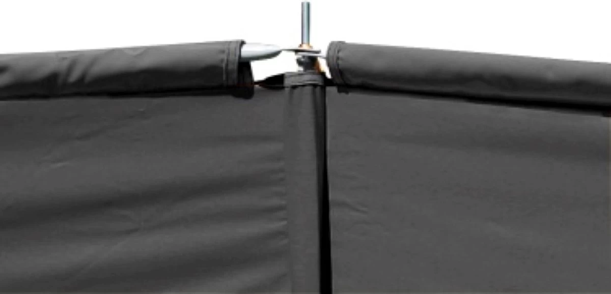 Lichtgewicht maar door zijn bovenligger zeer stabiel windscherm. Dit windscherm bestaat uit 3 vlakken zodat altijd een aangenaam windvrij met privacy overladen plekje ontstaat.