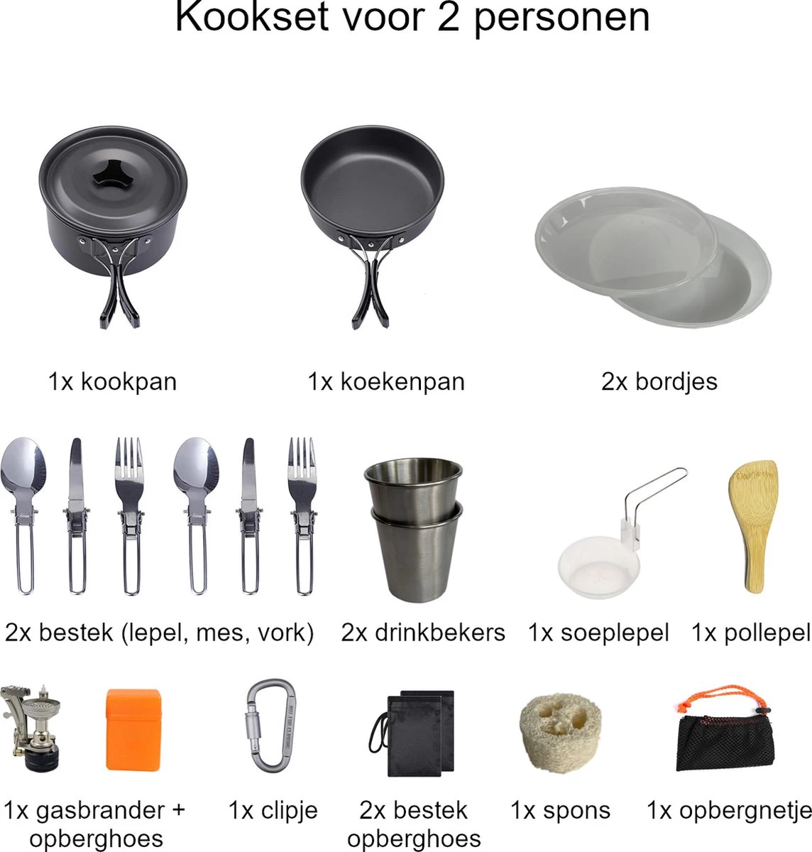 - Inbegrepen: 1 koekenpan, 1 kookpan met deksel, 2 bordjes, 1 opscheplepel/soeplepel, 1 gasbrander, 1 pollepel, 2 lepels, 2 vorken, 2 messen, 2 RVS drinkbekers, 1 afwasspons, 1 clipje, 1 opbergnetje, 1 gasbrander hoes, 2 bestek opbergzakjes.