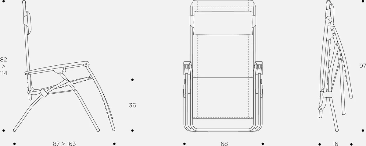 – Bevestiging: de metalen buizen en het doek worden verbonden door clips van elastomeer. Door dit gepatenteerde systeem van Lafuma geniet de gebruiker van een steviger comfort, bijzonder stevige ondersteuning van de rug, eenvoudige bevestiging/vervanging van het doek en is duurzaamheid verzekerd.