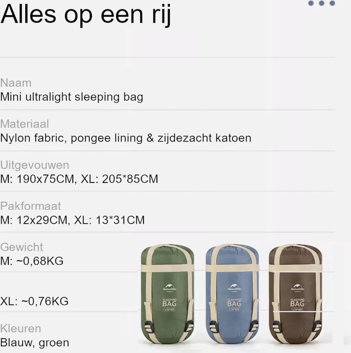 De LW180 slaapzak van Naturehike zorgt voor een optimale nachtrust tijdens al jouw outdoor activiteiten. Met een comforttemperatuur van ±15℃, en een ondergrens van ±8℃, blijf je lekker warm gedurende de nacht. Verder kent deze slaapzak een “splicing systeem”, waarmee je meerdere slaapzakken aan elkaar kan ritsen! Het pakformaat van 13*31cm en een totaalgewicht van ~0,76KG zorgt ervoor dat je deze slaapzak gemakkelijk met je mee kunt nemen. Deze slaapzak komt in 2 maten. Maat M heeft een afmeting van 190*75cm. Kortom een zeer compacte en lichtgewicht slaapzak die je ’s nachts lekker warm houdt gedurende je outdoor avonturen!