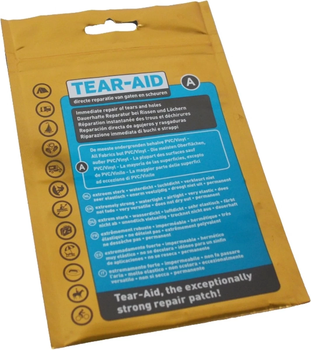 Een multifunctioneel en transparant reparatiemiddel. Tear-Aid A repareert permanent gaten en scheuren in praktisch alle materialen. Dit reparatiemiddel is extreem sterk, water- en luchtdicht, zeer elastisch, verkleurt niet en droogt niet uit. Ideaal voor permanente reparatie van een (party)tentdoek, polyester (grond-)zeilen, slaapzakken, canvas luchtbedden, self inflating matten, fietsbanden, boten, kano’s, zonneschermen, parasols, jerrycans, duikpakken, zwembaden, vliegers, jassen en tassen. Tevens is het geschikt voor gebruik op producten van aluminium, roestvrij staal, polyester en meer (behalve PVC en Vinyl, hiervoor is Tear-Aid B geschikt). De reparatieset bevat een strook Tear-Aid reparatietape (30x8cm), een verstevigingsdraad (45cm) voor reparatie van scheuren aan randen en vier alcoholdoekjes voor het reinigen van de ondergrond.
