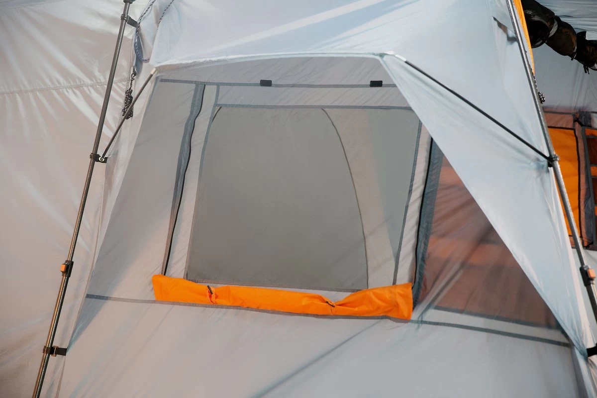 De ventilatieopening aan de zijkant zorgt voor een optimale luchtcirculatie en de aparte ventilatieafdekking boven het tentdak beschermt tegen regen en sneeuw.